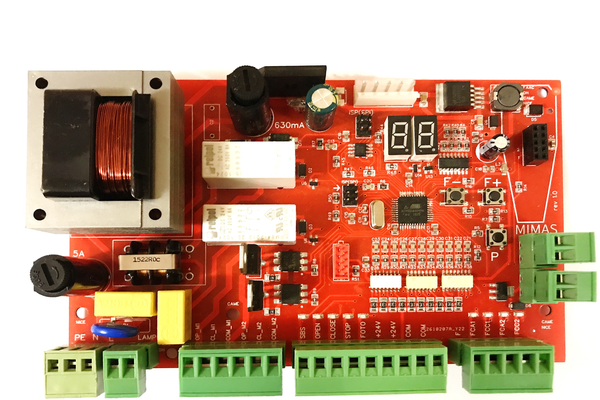 MIMAS — это универсальная плата управления, с возможностью подключения 2-х моторов переменного тока 220В, радиоприёмников, фотоэлементов, светофоров и различных сигнальных ламп. Предназначена для управления приводами распашных ворот, оснащенных механическими или герконовыми датчиками концевых положений или без таковых (работающих по упорам). Плата блока управления снабжена встроенным разъемом для подключения радиоприемников FAAC серии RP и DOORHAN RECEIVER 433, а так же разъемом SM для подключения приемников NICE серии и универсальных приемников OXI, и разъемом AF для подключения приемников CAME AF43S/RU.